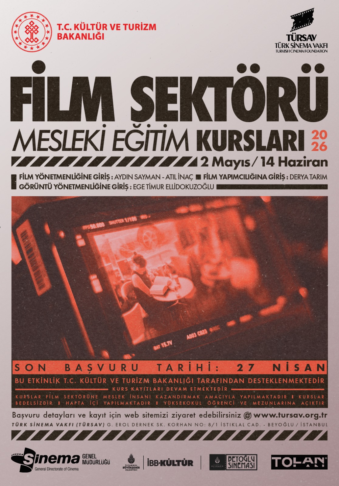 T.C. Kültür ve Turizm Bakanlığı & Sinema Genel Müdürlüğü destekleriyle düzenlenen kurslarımız alanında yetkin eğitmenleriyle Tolan Films stüdyosu ve İBB Beyoğlu Sineması Pera Salonu'nda gerçekleştirilecektir.